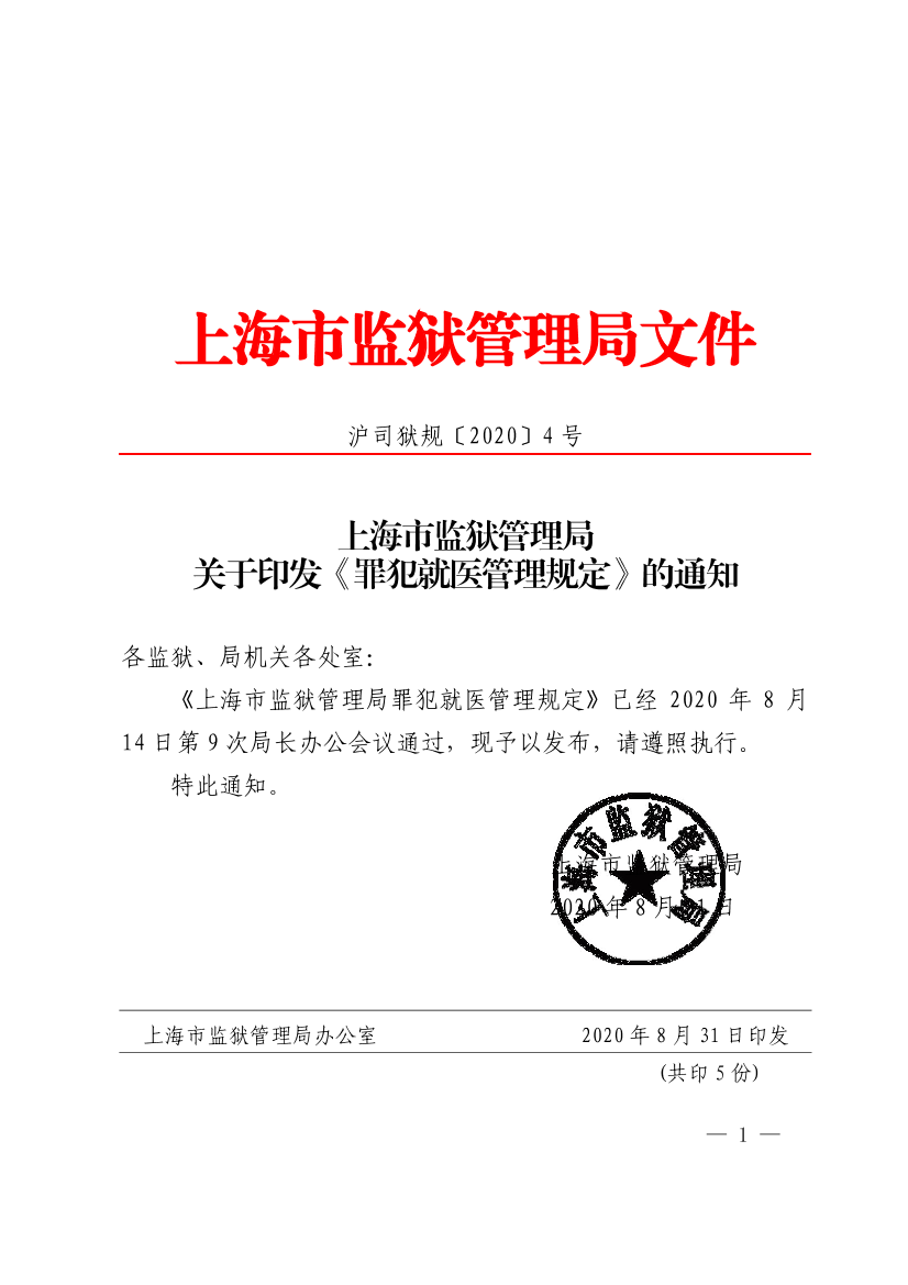 上海市监狱管理局办公室 2020年8月31日印发